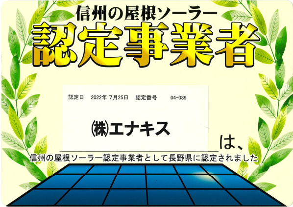 エナキスはこの度、長野県に「信州の屋根ソーラー認定事業者」として認定を受けました。