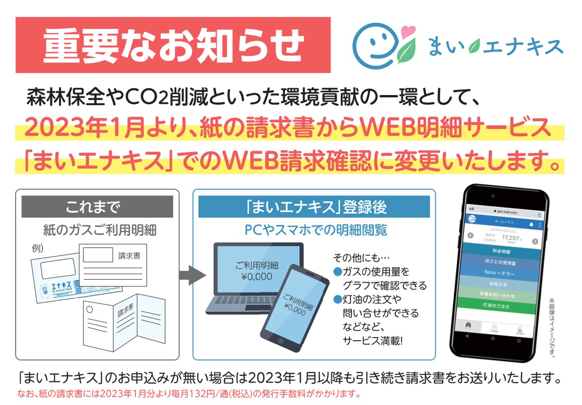 森林保全やCO2削減といった環境貢献の一環として、2023年1月より紙の請求書からWEB明細サービス「まいエナキス」でのWEB請求確認に変更いたします。 「まいエナキス」のお申込みがない場合は2023年1月以降も引き続き請求書をお送りします。 ※なお、紙の請求には2023年1月より毎月132円/通(税込)の発行手数料がかかります。