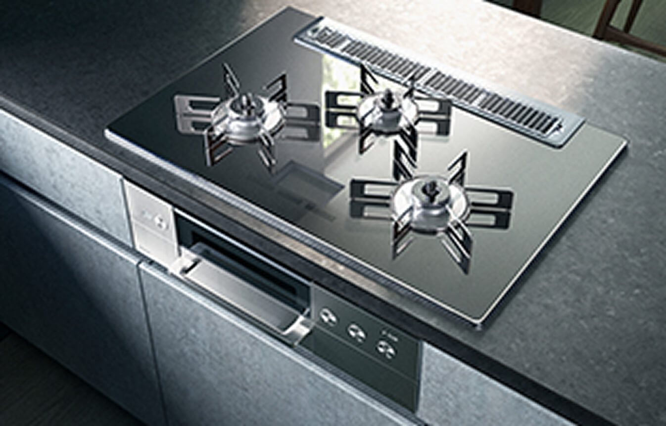 ガラストップとステンレス前面パネルの組み合わせで、キッチンが一気に高級感アップ!