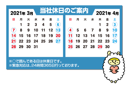 ※○で囲んである日は休業日です。 ※緊急対応は、24時間365日行っております。