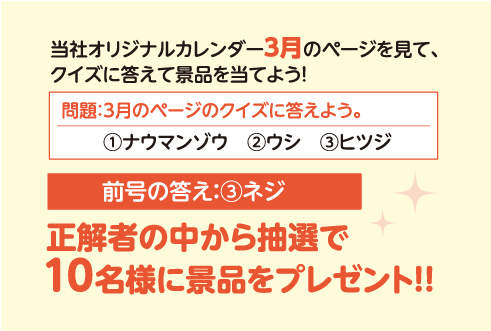 当社オリジナルカレンダー3月のページを見て、クイズに答えて景品を当てよう!