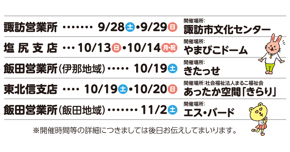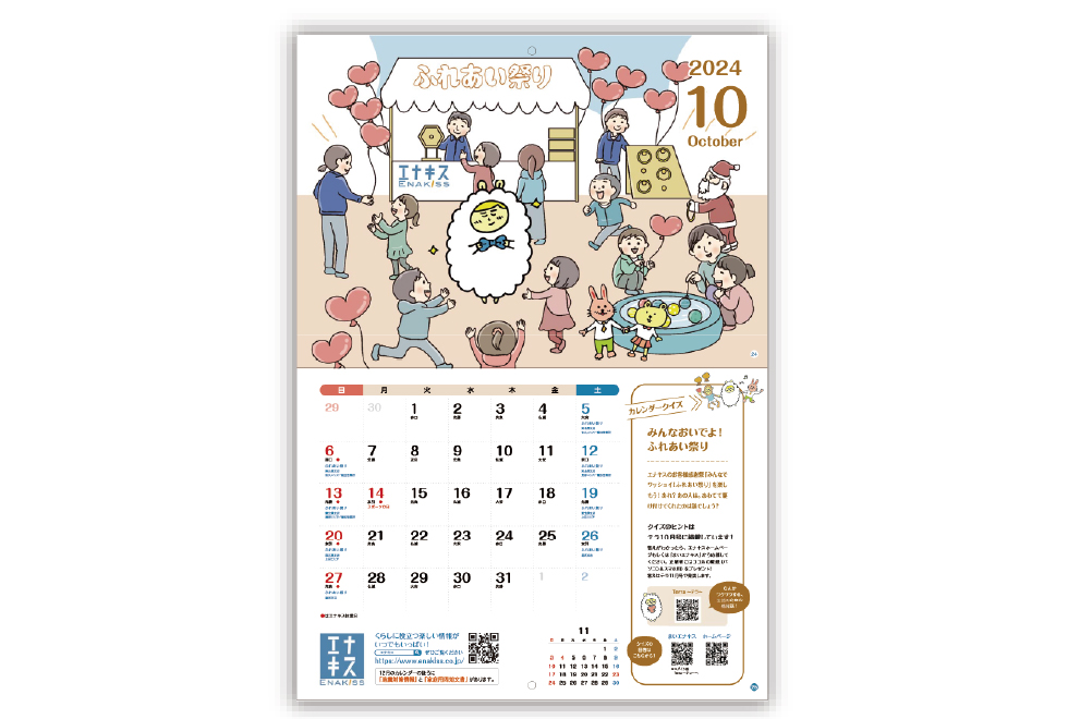 すでにお配りしております「エナキス2024年オリジナルカレンダー」の10月のページに、各会場のふれあい祭り開催日が記載されておりますが、こちらは上記の日程に変更となります。お客さまには混乱を招き、ご迷惑をおかけしますこと深くお詫び申し上げます。