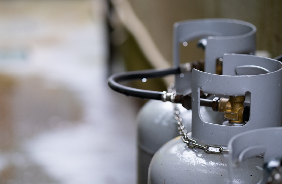 身の安全を確保した上で、容器バルブを閉め、容器が倒れたり流されたりしないかしっかりと固定されているか確かめてください。