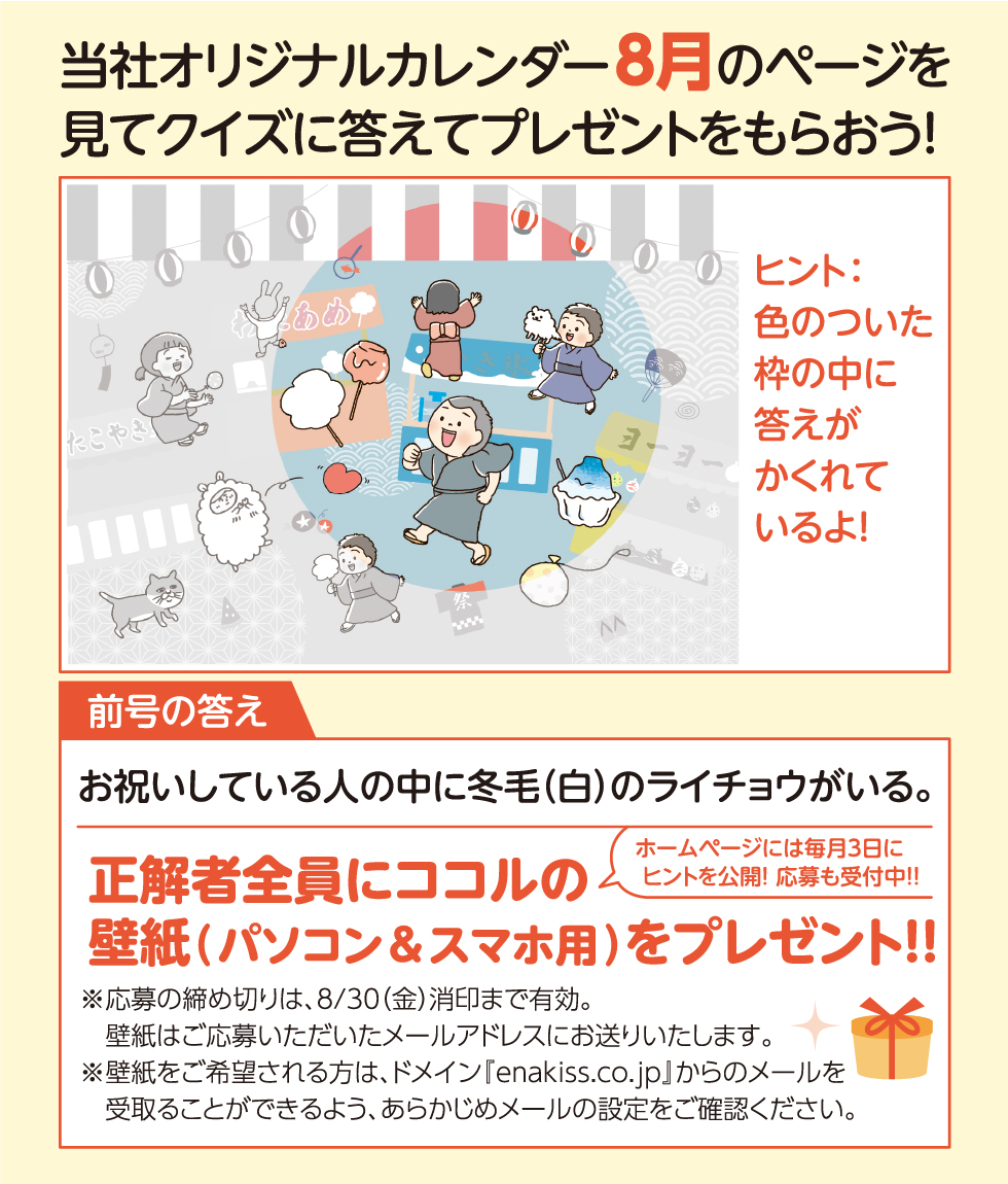 当社オリジナルカレンダー8月のページを見て、クイズに答えて景品を当てよう!