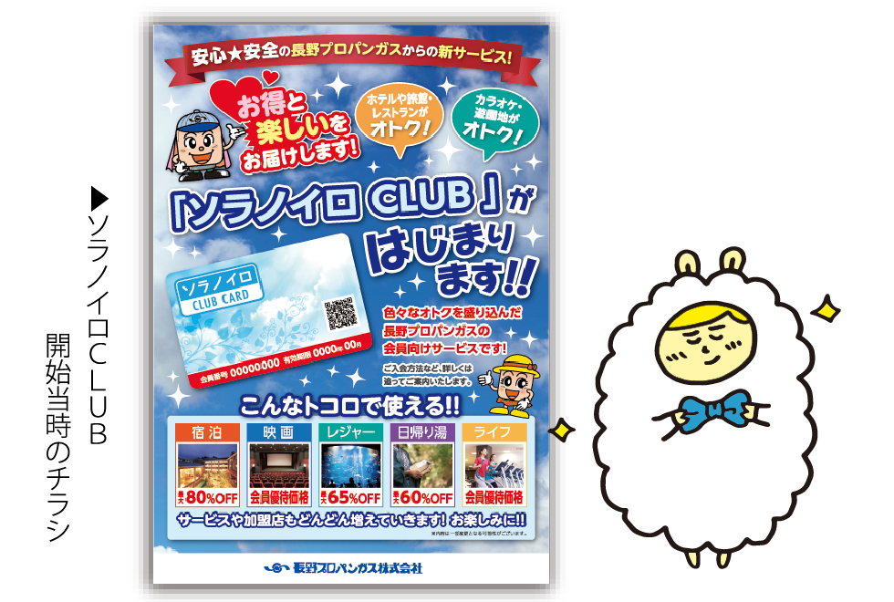 2016年4月、「ソラノイロCLUB」のサービスを開始しました。灯油・ガス機器の会員割引、県内様々な施設でお得な特典を受けられる、などのお客さま優待サービスを総称して「ソラノイロCLUB」と言い、開始当時はお申込制での会員サービスでしたが、現在では弊社のガスをご利用いただいている全てのお客さまにご利用いただける無料の会員サービスとなっています。