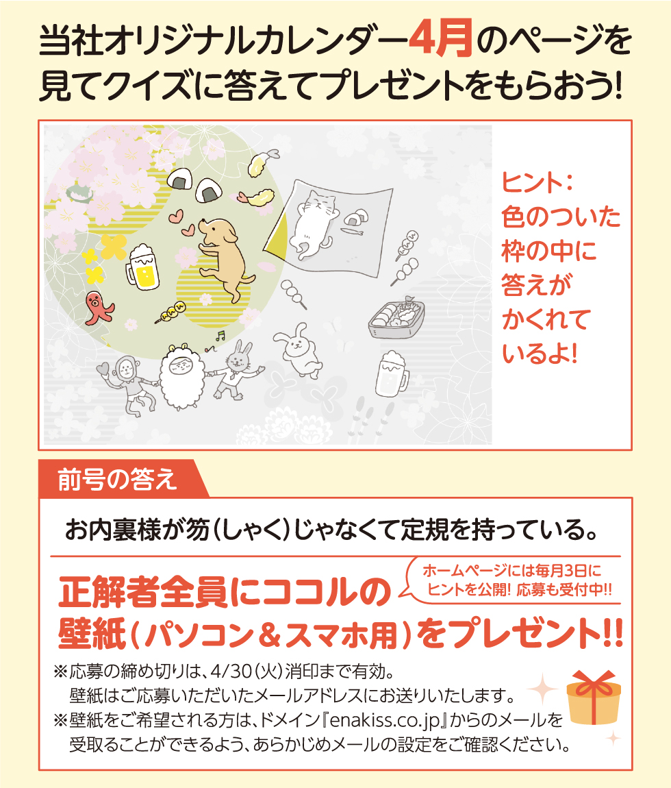 当社オリジナルカレンダー4月のページを見て、クイズに答えて景品を当てよう!