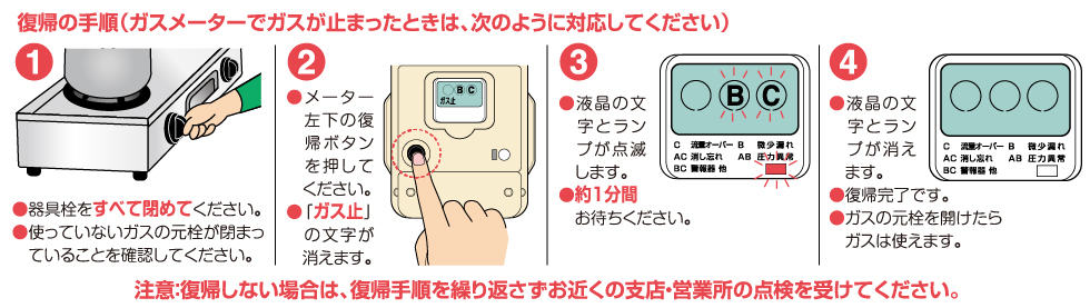 ②メーター左下の復帰ボタンを押してください。「ガス止」の文字が消えます。