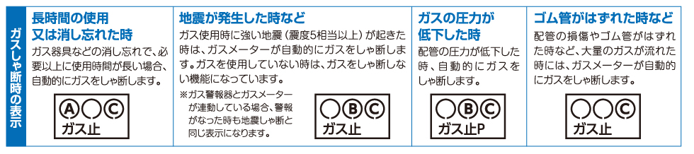 ガス器具などの消し忘れで、必要以上に使用時間が長い場合、自動的にガスをしゃ断します。