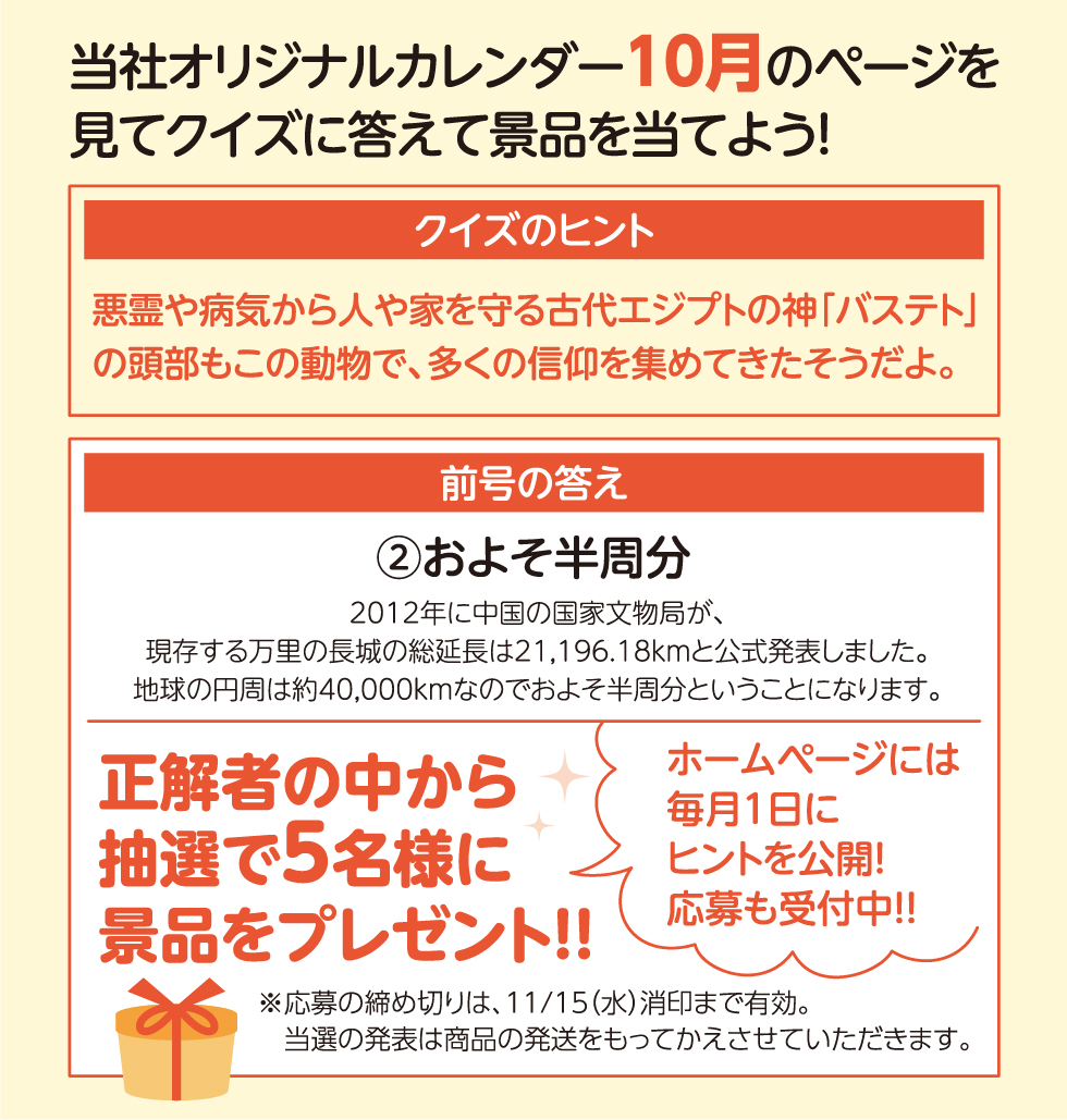 当社オリジナルカレンダー10月のページを見て、クイズに答えて景品を当てよう!