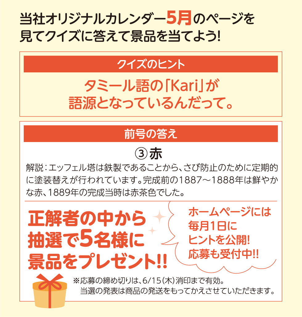 当社オリジナルカレンダー5月のページを見て、クイズに答えて景品を当てよう!