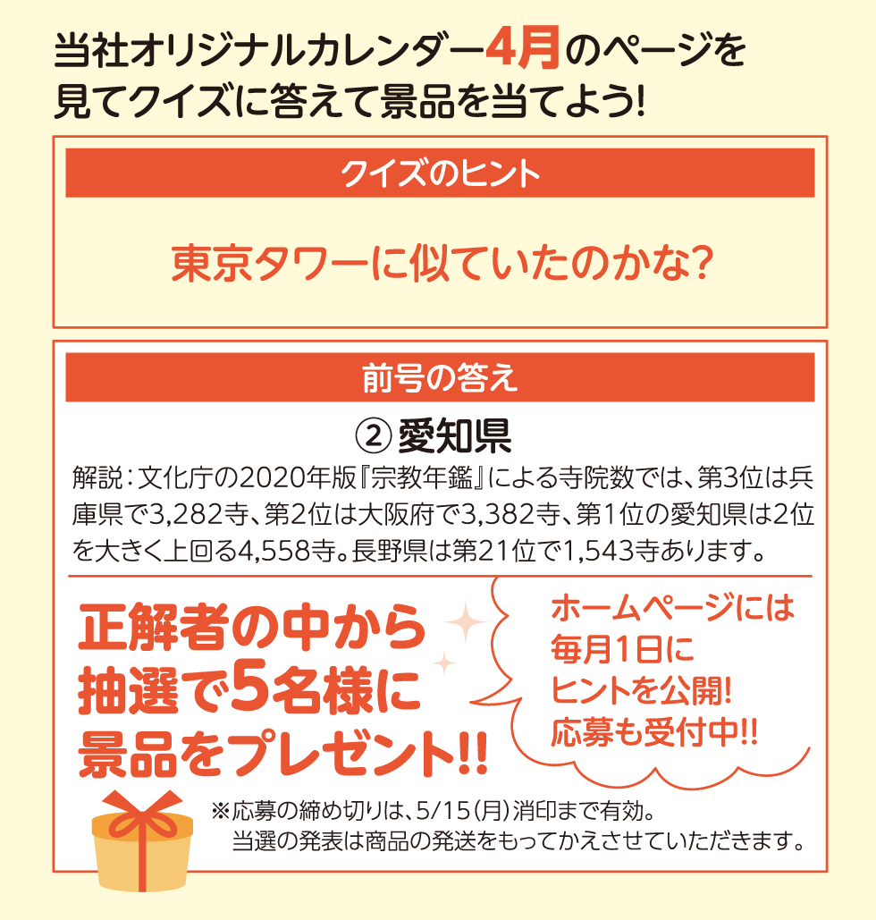当社オリジナルカレンダー4月のページを見て、クイズに答えて景品を当てよう!