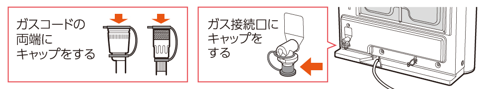 ⑤ガスコードを本体から外し、ガスコードと機器のガス接続口にキャップをする。