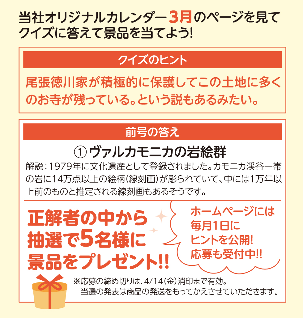 当社オリジナルカレンダー3月のページを見て、クイズに答えて景品を当てよう!