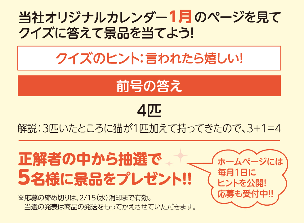 当社オリジナルカレンダー2月のページを見て、クイズに答えて景品を当てよう!