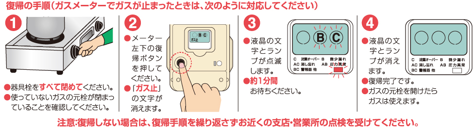 復帰の手順(ガスメーターでガスが止まったときは、次のように対応してください)