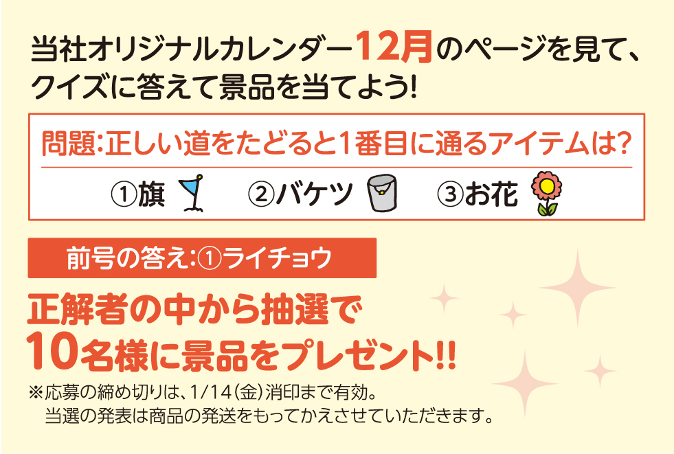 当社オリジナルカレンダー12月のページを見て、クイズに答えて景品を当てよう!