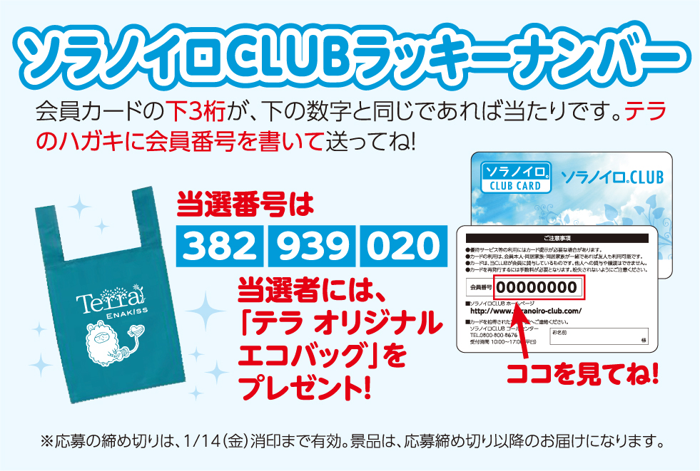 会員カードの下3桁が、下の数字と同じであれば当たりです。テラのハガキに会員番号を書いて送ってね!