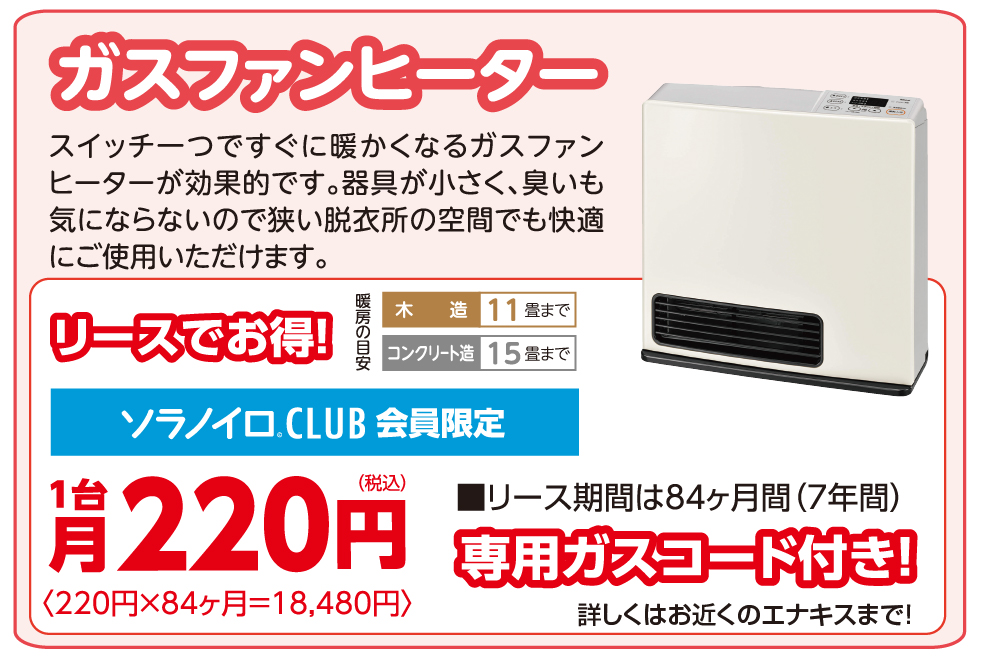 スイッチ一つですぐに暖かくなるガスファンヒーターが効果的です。器具が小さく、臭いも気にならないので狭い脱衣所の空間でも快適にご使用いただけます。