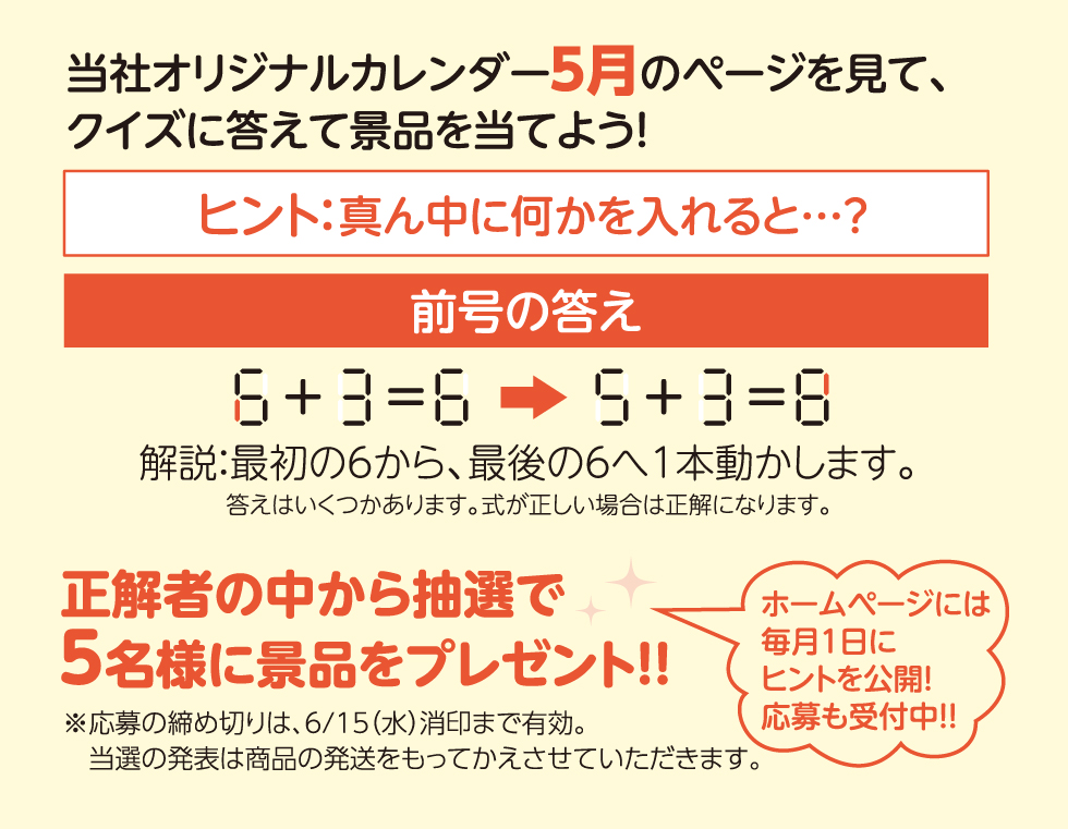 当社オリジナルカレンダー5月のページを見て、クイズに答えて景品を当てよう!