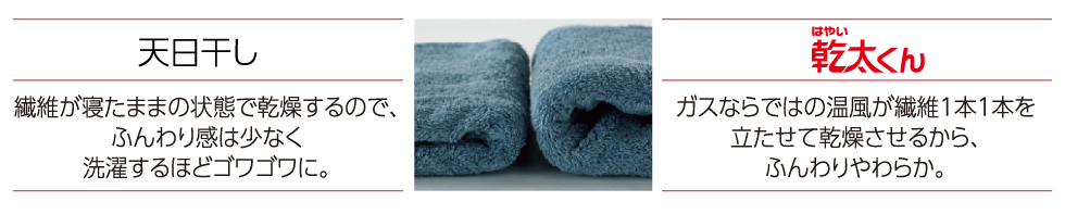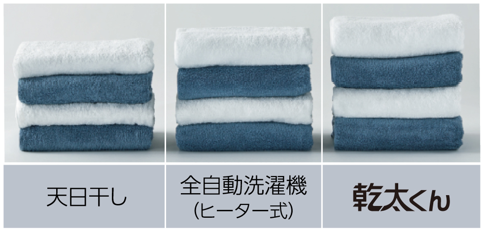 梅雨の洗濯物の悩みといえば、部屋干しによる「生乾き臭」。80℃以上の温風で乾燥する「乾太くん」なら、生乾き臭の元となる「モラクセラ菌」の発育を抑制し、外干しや日光消毒でも除去できないニオイを取り除きます。そして仕上がりは、新品のタオルのように繊維を立ち上げふんわり♪