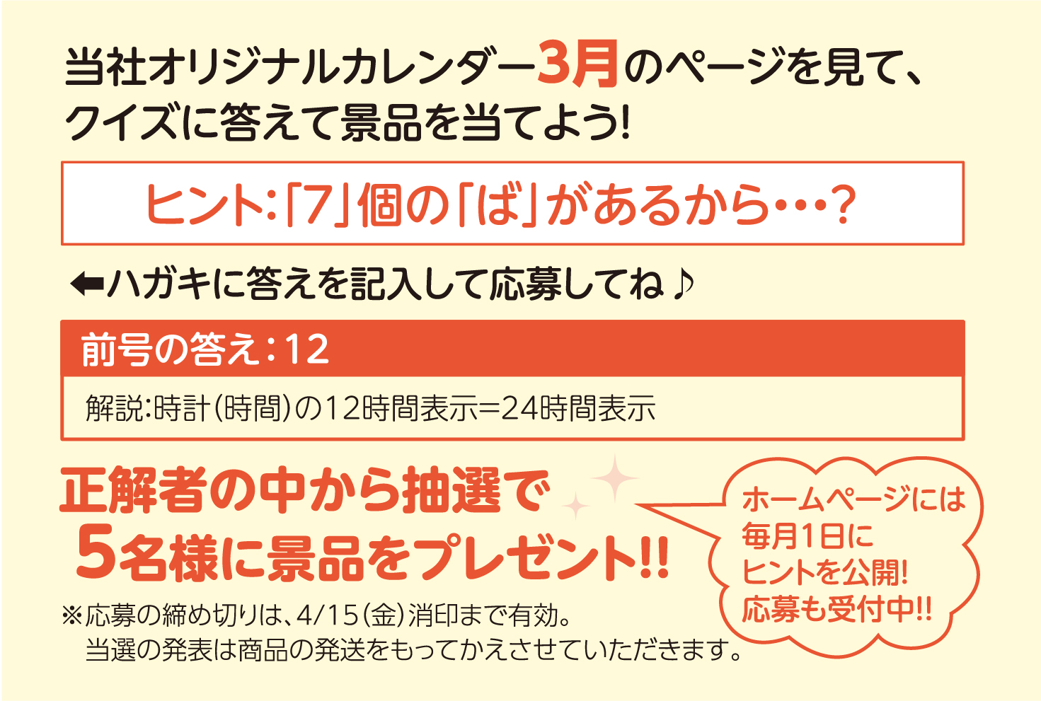 当社オリジナルカレンダー3月のページを見て、クイズに答えて景品を当てよう!