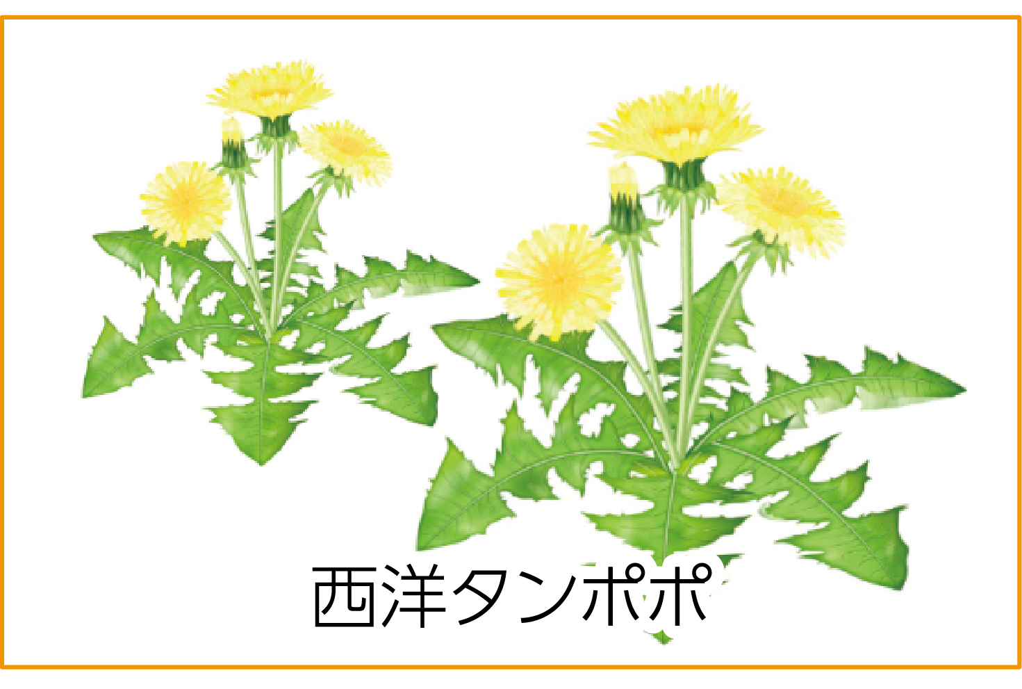 西洋タンポポは鮮やかな黄色とたくさんの花びらが特徴。英名はダンデライオン。ライオンの歯という意味で、葉のギザギザがライオンの歯に見えることから、その名がついたのだそう。現在、日本で見られるタンポポの8割は、外来種である西洋タンポポや在来種との交雑種と言われています。