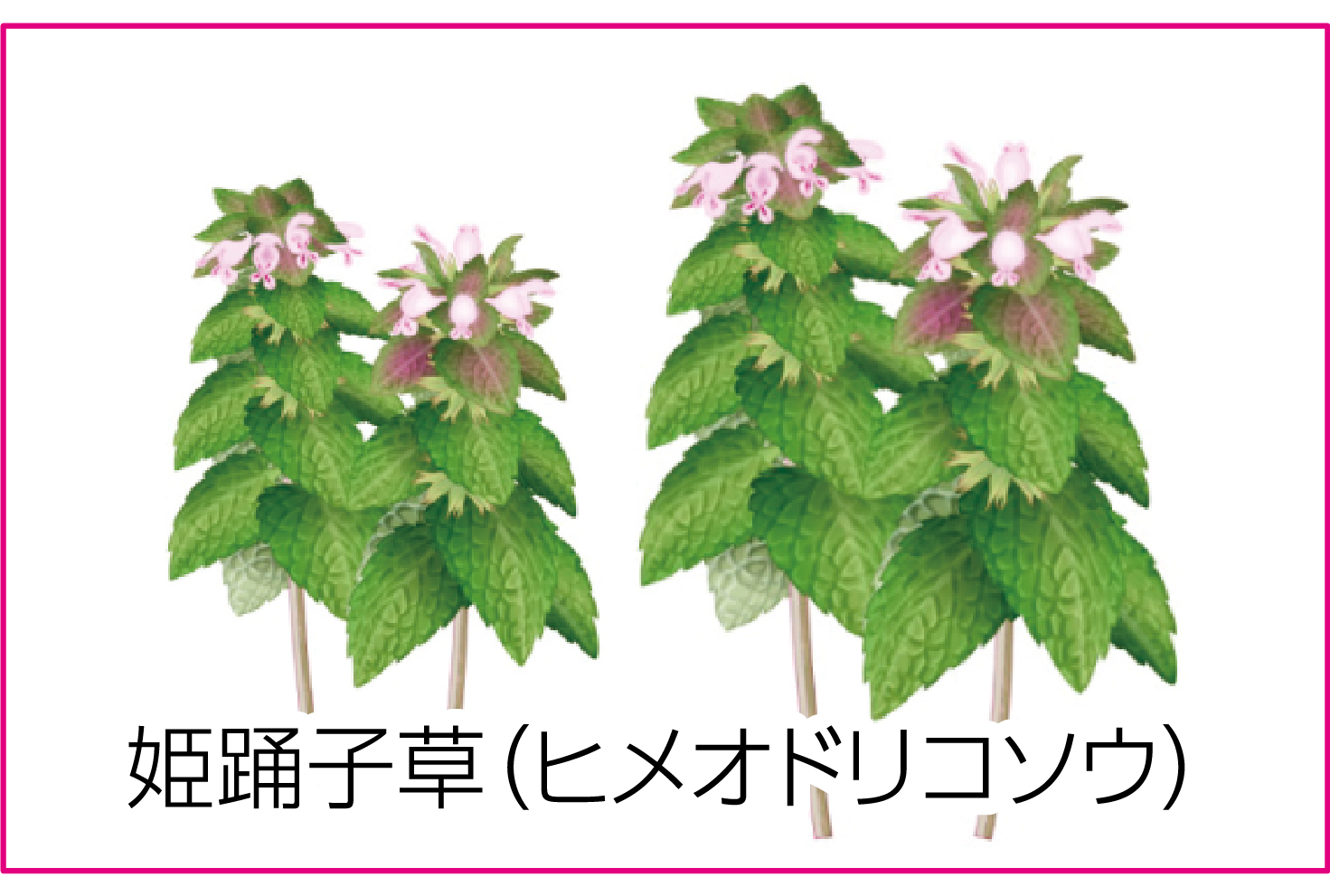 葉っぱが五重塔のようになっている草花。小さな薄紫色の花と、シソ科ならではの紫色の葉が特徴です。花が白く、もう少し大きいものは踊子草(オドリコソウ)と呼ばれています。