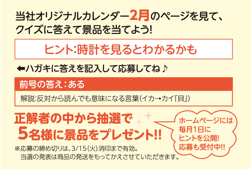 当社オリジナルカレンダー2月のページを見て、クイズに答えて景品を当てよう!