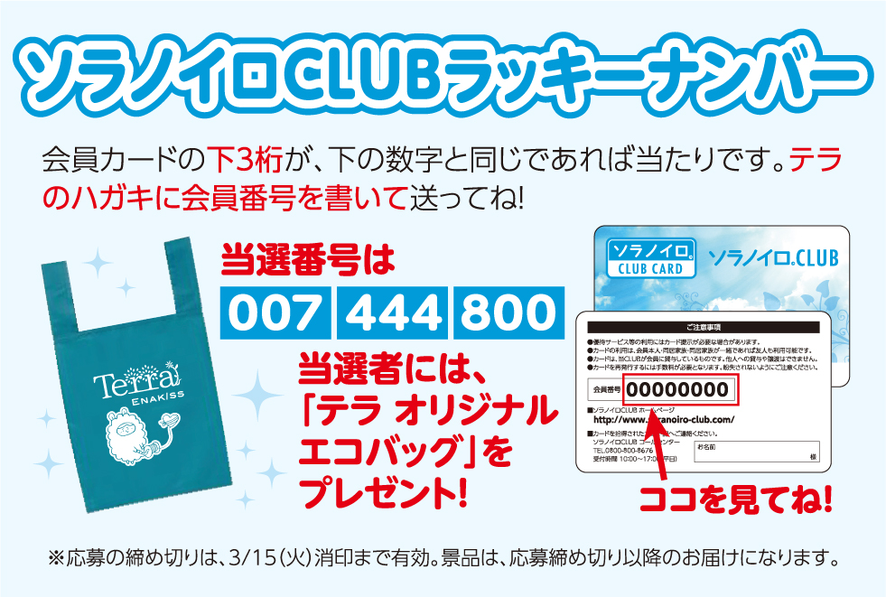 会員カードの下3桁が、下の数字と同じであれば当たりです。テラのハガキに会員番号を書いて送ってね!